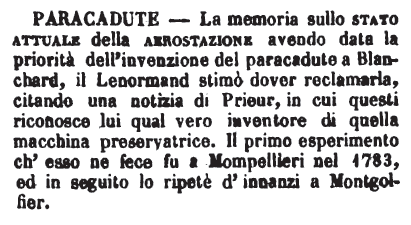 | Paracadute - La memoria sullo stato attuale della aerostazione avendo data la priorità dell'invenzione del paracadute a Blanchard, il Lenormand stimò dover reclamarla, citando una notizia di Prieur, in cui questi riconosce lui qual vero inventore di quella macchina preservatrice. Il primo esperimento ch'esso ne fece fu a Mompellieri nel 1783, ed in seguito lo ripetè d'innanzi a Montgolfier. [immagine] |
