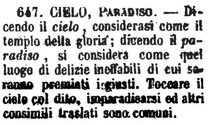 | Cielo, Paradiso - Dicendo il cielo, considerasi come il templo della gloria; dicendo il paradiso, si considera come quel luogo di delizie ineffabili di cui saranno premiati i giusti. Toccare il cielo col dito, imparadisarsi ed altri consimili traslati sono comuni. [immagine] |