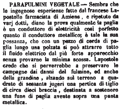 | Parafulmini vegetale - Sembra che le ingegnose esperienze fatte dal francese Lapostolle farmacista di Amiens, e ripetute da varj dotti, diano la prova qualmente la paglia è un conduttore di elettricità così perfetto quanto il conduttore metallico; è tale la sua possanza, che un pezzo di corda di paglia lungo una polzata di può attrarre tutto il fluido elettrico dal più forte apparecchio senza provarne la minima scossa. Lapostole crede che si perverrebbe a preservare le campagne dai danni del fulmine, ed anche della grandine, alzando sul terreno a quadrato di sessanta jugeri una pertica di tiglio di circa dieci braccia, destinata a sostenere una fune di paglia avente sopra una punta metallica. [immagine] |