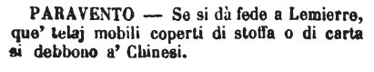 | Paravento - Se si dà fede a Lemierre, que' telaj mobili coperti di stoffa o di carta si debbono a' Chinesi. [immagine] |