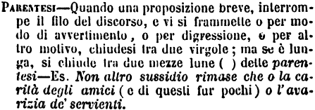 | Parentesi - Quando una proposizione breve, interrompe il filo del discorso, e vi si frammette o per modo di avvertimento, o per digressione, o per altro motivo, chiudesi tra due virgole; ma se è lunga, si chiude tra due mezze lune ( ) dette parentesi - Es. Non altro sussidio rimase che o la carità degli amici (e di questi fur pochi) o l'avarizia de' servienti. [immagine] |