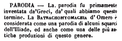 | Parodia - La parodia fu primamente inventata da'Greci, da'quali abbiamo questo termine. La Batrachomyomachia d'Omero è considerata come una parodia di alcuni squarci dell'Illiade, ed anche come una delle più antiche produzioni di questo genere. [immagine] |