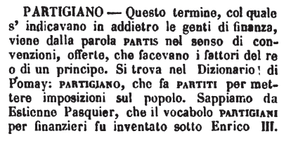 | Partigiano - Questo termine, col quale s'indicavano in addietro le genti di finanza, viene dalla parola partis nel senso di convenzioni, offerte, che facevano i fattori del re o di un principe. Si trova nel Dizionario di Pomay: partigiano, che fa partiti per mettere imposizioni sul popolo. Sappiamo da Estienne Pasquier, che il vocabolo partigiani per finanzieri fu inventato sotto Enrico III. [immagine] |