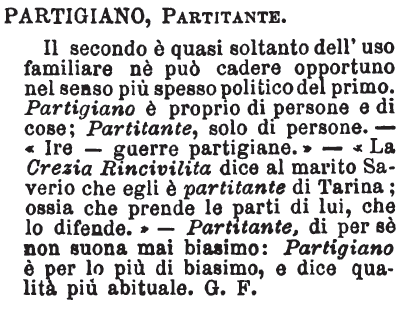 | Partigiano, Partitante - Il secondo è quasi soltanto dell'uso familiare nè può cadere opportuno nel senso più spesso politico del primo. Partigiano è proprio di persone e di cose; Partitante, solo di persone. - «Ire - guerre partigiane.» - «La Crezia Rincivilita dice al marito Saverio che egli è partitante di Tarina; ossia che prende le parti di lui, che lo difende.» - Partitante, di per sè non suona mai biasimo: Partigiano è per lo più di biasimo, e dice qualità più abituale. G. F. [immagine] |