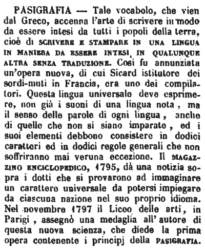 | Pasigrafia - Tale vocabolo, che vien dal Greco, accenna l'arte di scrivere in modo da essere intesi da tutti i popoli della terra, cioè di scrivere e stampare in una lingua in maniera da essere intesi in qualunque altra senza traduzione. Così fu annunziata un'opera nuova, di cui Sicard istitutore dei sordi-muti in Francia, era uno dei compilatori. Questa lingua universale deve esprimere, non già i suoni di una lingua nota, ma il senso delle parole di ogni lingua, anche di quelle che non si siano imparate, ed i suoi elementi debbono consistere in dodici caratteri ed in dodici regole generali che non soffriranno mai veruna eccezione. Il magazzino enciclopedico, 1795, dà una notizia sopra i dotti che si provarono ad immaginare un carattere universale da potersi impiegare da ciascuna nazione nel suo proprio idioma. Nel novembre 1797 il Liceo delle arti, in Parigi, assegnò una medaglia all'autore di questa nuova scienza, che diede la prima opera contenente i principj della pasigrafia. [immagine] |