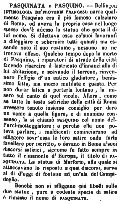 Pasquinata e Pasquino - Bellingen (etimologia de’ proverbi francesi) narra qualmente Pasquino era il più famoso calzolaro di Roma, ed aveva la propria casa nel luogo stesso dov’è adesso la statua che porta il di lui nome. Si dilettava esso co’ suoi lavoranti a dileggiare e schernire tutti quanti; ma essendo noto il suo costume, nessuno se ne trovava offeso. Qualche tempo dopo la morte di Pasquino, i riparatori di strade della città facendo risarcire il lastricato d’innanzi alla di lui abitazione, e scavando il terreno, rinvennero l’effigie d’un antico gladiatore, benissimo fatta, ma mezzo mutilata e guasta. Per non durar fatica a portarla lontano, la misero sul canto di quel vicolo. Allora, come se tutte le teste satiriche della città di Roma avessero tenuto insieme consiglio per dare un nome a quella figura, e di unanime consenso, la si chiamò pasquino col nome dell’arci-motteggiatore; e perchè ella non poteva parlare, i maldicenti cominciarono ad affiggere sovr’essa le loro satire onde farla favellare per iscritto, e davano in Roma a’ suoi discorsi satirici, siccome fu fatto sempre in tutto il rimanente d’Europa, il titolo di pasquinata. La statua di Marforio, alla quale si attaccavano le risposte a quei discorsi, serve al dì d’oggi di fontana ad un’ala del Campidoglio.