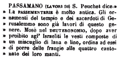 | Passamano (Lavori di) - S. Peuscet dice: «La passementerie è molto antica. Gli ornamenti del tempio e dei sacerdoti di Gerusalemme sono già lavori di questo genere. Mosè nel deuteronomio, dopo aver proibito agl'Israeliti le vesti composte di un miscuglio di lana e lino, ordina ad essi di porre delle frangie alle quattro cantonate dei loro manti. [immagine] |