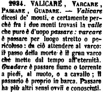 | Valicare, Varcare, Passare, Guadare - Valicare dicesi de' monti, e certamente perchè fra i due monti trovasi la valle che pure è d'uopo passare: varcare è passare per luogo stretto o pericoloso: da ciò attendere al varco: il passo della morte è il gran varco che mette dal tempo all'eternità. Guadare è passare fiume o torrente a piedi, al nuoto, o a cavallo; il passarlo è proprio in barca. Passare ha più altri sensi ovvii e conosciuti. [immagine] |