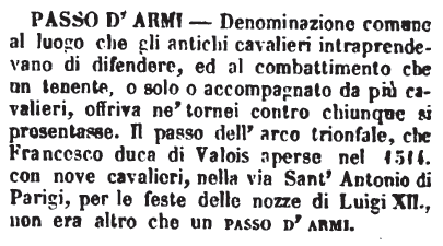 | Passo d’armi - Denominazione comune al luogo che gli antichi cavalieri intraprendevano di difendere, ed al combattimento che un tenente, o solo o accompagnato da più cavalieri, offriva ne' tornei contro chiunque si presentasse. Il passo dell'arco trionfale, che Francesco duca di Valois aperse nel 1514. con nove cavalieri, nella via Sant'Antonio di Parigi, per le feste delle nozze di Luigi XII., non era altro che un passo d'armi. [immagine] |