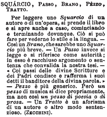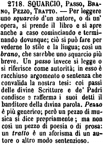 | Squarcio, Passo, Brano, Pezzo, Tratto - Per leggere uno Squarcio di un autore o di un'opera, si prende il libro e si apre anche a caso, cominciando e terminando dovunque. Ciò si può fare per vederne lo stile e la lingua. - Così un Brano, che sarebbe uno Squarcio più breve. - Un Passo invece si legge o si riferisce come autorità; in esso è racchiuso argomento o sentenza che convalida la nostra tesi. - «Coi passi delle divine Scritture e dei Padri condisce e rafferma i suoi detti il banditore della divina parola.» - Pezzo è più generico. Però un pezzo di musica si dice propriamente, ma non così un pezzo di poesia o di prosa. - Un Tratto è un aforisma di un autore o altro modo sentenzioso. (Zecchini). [immagine] |