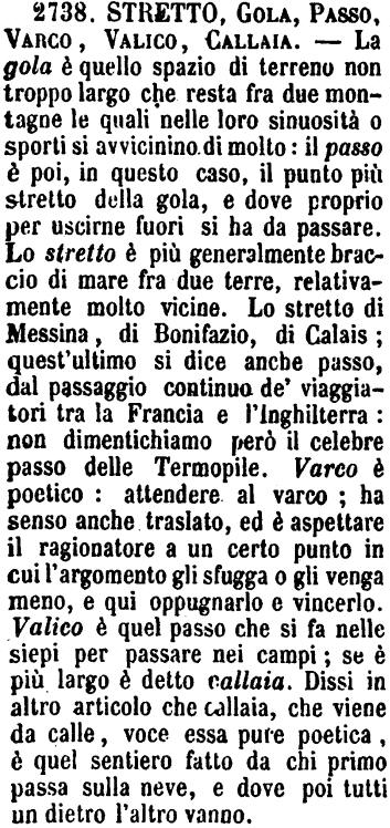 | Stretto, Gola, Passo, Varco, Valico, Callaia - La gola è quello spazio di terreno non troppo largo che resta fra due montagne le quali nelle loro sinuosità o sporti si avvicinino di molto: il passo è poi, in questo caso, il punto più stretto della gola, e dove proprio per uscirne fuori si ha da passare. Lo stretto è più generalmente braccio di mare fra due terre, relativamente molto vicine. Lo stretto di Messina, di Bonifazio, di Calais; quest'ultimo si dice anche passo, dal passaggio continuo de' viaggiatori tra la Francia e l'Inghilterra: non dimentichiamo però il celebre passo delle Termopile. Varco è poetico: attendere al varco; ha senso anche traslato, ed è aspettare il ragionatore a un certo punto in cui l'argomento gli sfugga o gli venga meno, e qui oppugnarlo e vincerlo. Valico è quel passo che si fa nelle siepi per passare nei campi; se è più largo è detto callaia. Dissi in altro articolo che callaia, che viene da calle, voce essa pure poetica, è quel sentiero fatto da chi primo passa sulla neve, e dove poi tutti un dietro l'altro vanno. [immagine] |