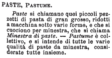 | Paste, Pastume - Paste si chiamano quei piccoli pezzetti di pasta di gran grosso, ridotti a macchina sotto varie forme, e che si cuociono per minestra, che si chiama Minestra di paste. - Pastume è collettivo, e si intende di tutte le varie qualità di paste da minestra, considerate tutte insieme. [immagine] |