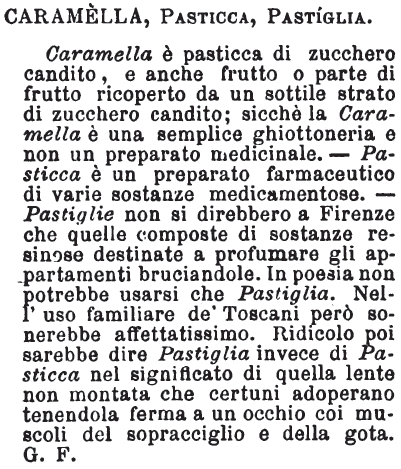 | Caramella, Pasticca, Pastiglia - Caramella è pasticca di zucchero candito, e anche frutto o parte di frutto ricoperto da un sottile strato di zucchero candito; sicchè la Caramella è una semplice ghiottoneria e non un preparato medicinale. - Pasticca è un preparato farmaceutico di varie sostanze medicamentose. - Pastiglie non si direbbero a Firenze che quelle composte di sostanze resinose destinate a profumare gli appartamenti bruciandole. In poesia non potrebbe usarsi che Pastiglia. Nell'uso familiare de' Toscani però sonerebbe affettatissimo. Ridicolo poi sarebbe dire Pastiglia invece di Pasticca nel significato di quella lente non montata che certuni adoperano tenendola ferma a un occhio coi muscoli del sopracciglio e della gota. G. F. [immagine] |
