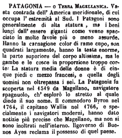 | Patagonia o Terra Magellanica - Vasta contrada dell'America meridionale, di cui occupa l'estremità al Sud. I Patagoni sono generalmente di alta statura, ma i beni lungi dall'essere giganti come venne spacciato in molte favole più o meno assurde. Hanno la carnagione color di rame cupo, son quadrati largamente, hanno la testa enorme, la parte superiore del corpo altissima, ma le gambe e le cosce in proporzioni troppo corte: La statura media delle donne è di cinque piedi e mezzo francesi, e quella degli uomini non oltrepassa i sei. La Patagonia fu scoperta nel 1519 da Magellano, navigatore spagnuolo, ch'esplorò lo stretto al quale diede il suo nome. Il commodoro Byron nel 1764, il capitano Wallis nel 1766, e specialmente i navigatori moderni, hanno dato notizie più precise che Magellano, ma non si sono inoltrati nell'interno. Il governo di Buenos Ayes reclama il possesso di quel paese. [immagine] |
