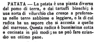 | Patata - La patata è una pianta diversa dal pomo di terra, e dai tartuffi bianchi; è una sorta di villucchio che cresce a preferenza nelle terre sabbiose e leggiere, e la di cui radica ha un sapore che si accosta a quello del marrone. Questa radica è buonissima cotta e cucinata in più modi; se ne può fare eziandio un ottimo pane. [immagine] |