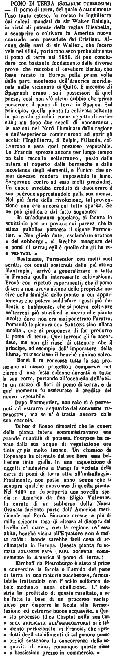 | Pomo di terra (Solanum Tuberosum) - Il pomo di terra, del quale è attualmente l'uso tanto esteso, fu recato in Inghilterra dai coloni mandati da sir Walter Raleigh, in virtù di patente della regina Elisabetta, a scuoprire e coltivare in America nuove contrade non possedute dai Cristiani. Alcune navi di sir Walter, che fecero vela nel 1584, portarono seco probabilmente il pomo di terra nel 1586. Si può concludere con bastante fondamento dalle diverse prove che raccolse il cavaliere Banks, che fosse recato in Europa pella prima volta dalle parti montuose dell'America meridionale nelle vicinanze di Quito. E siccome gli Spagnuoli erano i soli possessori di quel paese, così non v'è alcun dubbio che prima portarono il pomo di terra in Spagna. Sul principio, quella pianta fu coltivata soltanto in parecchi giardini come oggetto di curiosità; ma dopo due secoli di noncuranza, le nazioni del Nord illuminate dalla ragione e dall'esperienza cominciarono ad aprir gli occhi: l'Inghilterra, il Belgio, l'Olanda, coltivarono a gara quel prezioso vegetabile. La Francia sprezzò ancora per lungo tempo un tale raccolto sotterraneo, posto dalla natura al coperto dalle burrasche e dalla incostanza degli elementi, e l'unico che ormai dovesse rendere impossibile la fame. Sorgevano contro ad esso molti pregiudizj. Un cuoco avrebbe creduto di disonorare il suo padrone apprestandolo pella sua mensa. Nel più forte della rivoluzione, tal prevenzione non era ancora del tutto sparita. Se ne può giudicare dal fatto seguente: