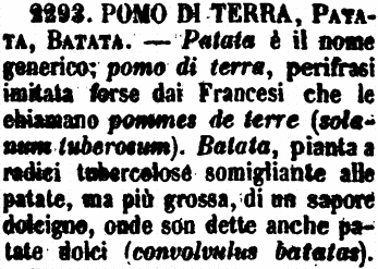 | Pomo di terra, Patata, Batata - Patata è il nome generico: pomo di terra, perifrasi imitata forse dai Francesi che le chiamano pommes de terre (solanum tuberosum). Batata, pianta a radici tubercelose somigliante alle patate, ma più grossa, di un sapore dolcigno, onde son dette anche patate dolci (convolvulus batatas). [immagine] |