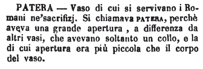 | Patera - Vaso di cui si servivano i Romani ne' sacrifizj. Si chiamava patera, perchè aveva una grande apertura, a differenza da altri vasi, che avevano soltanto un collo, e la di cui apertura era più piccola che il corpo del vaso. [immagine] |