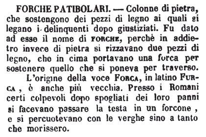 | Forche patibolari - Colonne di pietra, che sostengono dei pezzi di legno ai quali si legano i delinquenti dopo giustiziati. Fu dato ad esse il nome di forche, perchè in addietro invece di pietra si rizzavano due pezzi di legno, che in cima portavano una forca per sostenere quello che si poneva per traverso.