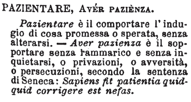 | Pazientare, Aver pazienza - Pazientare è il comportare l'indugio di cosa promessa o sperata, senza alterarsi. - Aver pazienza è il sopportare senza rammarico e senza inquetarsi, o privazioni, o avversità, o persecuzioni, secondo la sentenza di Seneca: Sapiens fit patientia quidquid corrigere est nefas. [immagine] |