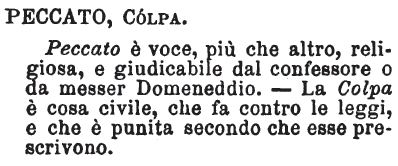 | Peccato, Colpa - Peccato è voce, più che altro, religiosa, e giudicabile dal confessore o da messer Domineddio. - La Colpa è cosa civile, che fa contro le leggi, e che è punita secondo che esse prescrivono. [immagine] |