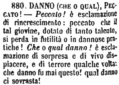 | Danno (che o qual), Peccato! - Peccato! è esclamazione di rincrescimento: peccato che il tal giovine, dotato di tanto talento, si perda in futilità o in dannose pratiche! Che o qual danno! è esclamazione di sorpresa e di vivo dispiacere, e di terrore qualche volta: che danno fu mai questo! qual danno ci sovrasta! [immagine] |