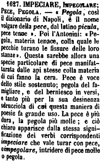 | Impeciare, Impegolare; Pece, Pegola - «Pegola, così il dizionario di Napoli, è il nome volgare della pece, dal latino picula, pece tenne». Poi l'Antonini: «Pegola, materia tenace, colla quale le pecchie turano le fissure delle loro stanze». Questa sarebbe allora una specie particolare di pece manifatturata dalle api stesse colla materia di cui fanno la cera. Pece è voce dello stile sostenuto; pegola del famigliare, e del berniesco in versi, e tanto più per la sua desinenza sdrucciola di cui questa maniera di poesie fa grande uso. La pece è più dura, la pegola più molle; e ciò chiaro apparisce dalla stessa significazione dei verbi corrispondenti impeciare che vale turar con pece, e impegolare, intridere di pece molle o pegola. [immagine] |