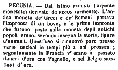 | Pecunia - Dal latino pecunia (argento monetato) derivato de pecus (armento). L'antica moneta de' Greci e de' Romani portava l'impronta di un bove, e le prime impronte che furono poste sulla moneta degli antichi popoli erano, secondo insegna la storia, figure d'animali. Quest'uso si rinnuovò pure presso varie nazioni in tempi più a noi prossimi; segnatamente in Francia v'erano in passato danari d'oro con l'agnello, e nel Belgio montoni d'oro. [immagine] |