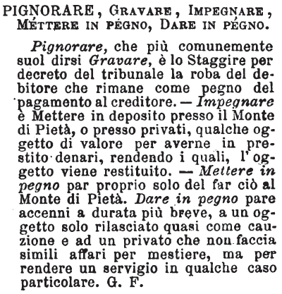 | Pignorare, Gravare, Impegnare, Mettere in pegno, Dare in pegno - Pignorare, che più comunemente suol dirsi Gravare, è lo Staggire per decreto del tribunale la roba del debitore che rimane come pegno del pagamento al creditore. - Impegnare è Mettere in deposito presso il Monte di Pietà, o presso privati, qualche oggetto di valore per averne in prestito denari, rendendo i quali, l'oggetto viene restituito. - Mettere in pegno par proprio solo del far ciò al Monte di Pietà. Dare in pegno pare accenni a durata più breve, a un oggetto solo rilasciato quasi come cauzione e ad un privato che non faccia simili affari per mestiere, ma per rendere un servigio in qualche caso particolare. G. F. [immagine] |