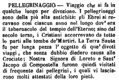 | Pellegrinaggio - Viaggio che si fa in qualche luogo per divozione. I pellegrinaggi sono della più alta antichità: gli Ebrei si recavano così ciascun anno nel luogo dov'era il tabernacolo del tempio dell'Eterno; sino dal secolo terzo, i Cristiani accorrevano da tutte le parti alle tombe de' Martiri. La Terra Santa fu per lunga pezza l'oggetto di que' divoti viaggi, che senza dubbio diedero causa alle Crociate; Nostra Signora di Loreto e Sant'Jacopo di Compostella furono quindi visitati di frequente dai pellegrini, i quali vi lasciarono molti attestati della loro pietà. [immagine] |