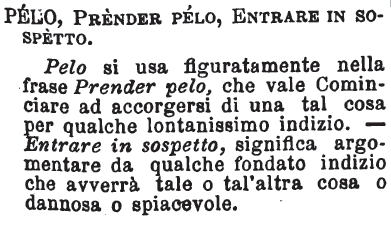 | Pelo, Prender pelo, Entrare in sospetto - Pelo si usa figuratamente nella frase Prender pelo, che vale Cominciare ad accorgersi di una tal cosa per qualche lontanissimo indizio. - Entrare in sospetto, significa argomentare da qualche fondato indizio che avverrà tale o tal'altra cosa o dannosa o spiacevole. [immagine] |