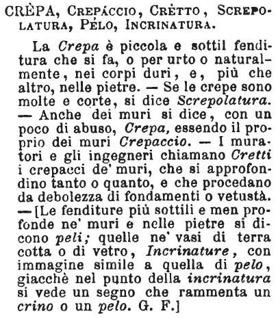 | Crepa, Crepaccio, Cretto, Screpolatura, Pelo, Incrinatura - La Crepa è piccola e sottil fenditura che si fa, o per urto o naturalmente, nei corpi duri, e, più che altro, nelle pietre. - Se le crepe sono molte e corte, si dice Screpolatura. - Anche dei muri si dice, con un poco di abuso, Crepa, essendo il proprio dei muri Crepaccio. - I muratori e gli ingegneri chiamano Cretti i crepacci de' muri, che si approfondino tanto o quanto, e che procedano da debolezza di fondamenti o vetustà. - [Le fenditure più sottili e men profonde ne' muri e nelle pietre si dicono peli; quelle ne' vasi di terra cotta o di vetro, Incrinature, con immagine simile a quella di pelo, giacchè nel punto della incrinatura si vede un segno che rammenta un crino o un pelo. G. F.] [immagine] |
