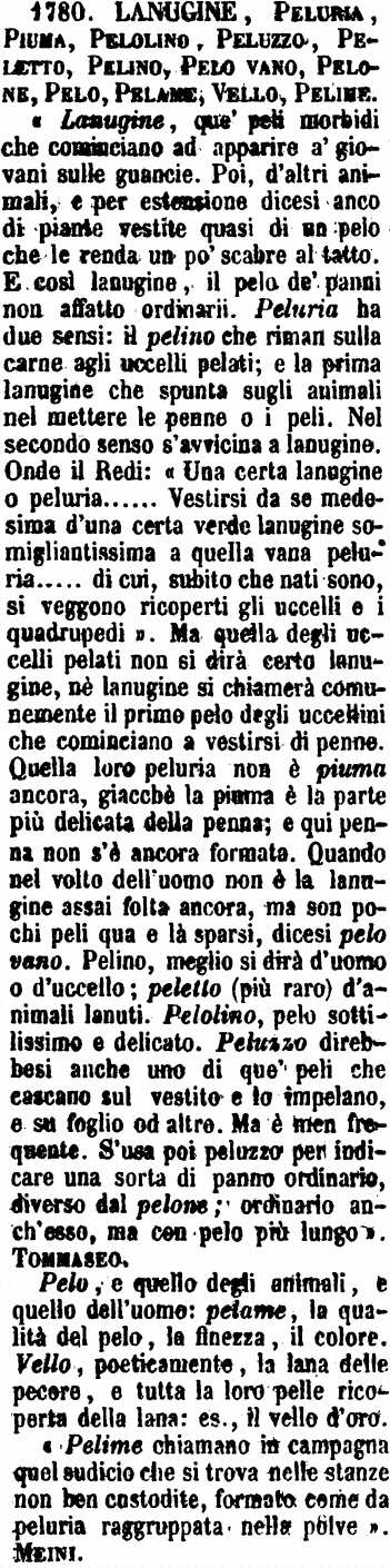 | Lanugine, Peluria, Piuma, Pelolino, Peluzzo, Peletto, Pelino, Pelo vano, Pelone, Pelo, Pelame; Vello, Pelime - «Lanugine, que' peli morbidi che cominciano ad apparire a' giovani sulle guancie. Poi, d'altri animali, e per estensione dicesi anco di piante vestite quasi di un pelo che le renda un po' scabre al tatto. E così lanugine, il pelo de' panni non affatto ordinarii. Peluria ha due sensi: il pelino che riman sulla carne agli uccelli pelati; e la prima lanugine che spunta sugli animali nel mettere le penne o i peli. Nel secondo senso s'avvicina a lanugine. Onde il Redi: «Una certa lanugine o peluria ...... Vestirsi da se medesima d'una certa verde lanugine somigliantissima a quella vana peluria..... di cui, subito che nati sono, si veggono ricoperti gli uccelli e i quadrupedi». Ma quella degli uccelli pelati non si dirà certo lanugine, nè lanugine si chiamerà comunemente il primo pelo degli uccellini che cominciano a vestirsi di penne. Quella loro peluria non è piuma ancora, giacchè la piuma è la parte più delicata della penna; e qui penna non s'è ancora formata. Quando nel volto dell'uomo non è la lanugine assai folta ancora, ma son pochi peli qua e là sparsi, dicesi pelo vano. Pelino, meglio si dirà d'uomo o d'uccello; peletto (più raro) d'animali lanuti. Pelolino, pelo sottilissimo e delicato. Peluzzo direbbesi anche uno di que' peli che cascano sul vestito e lo impelano, e su foglio od altro. Ma è men frequente. S'usa poi peluzzo per indicare una sorta di panno ordinario, diverso dal pelone; ordinario anch'esso, ma con pelo più lungo». Tommaseo.