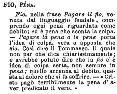 «Fio, in origine, è voce feudale, che vale: il tributo solito a pagarsi dal vassallo al signore. Fio, del resto, comprende ogni sorta di pena considerata come debito. Pena sveglia sempre l'idea di colpa; e il fio si può pagare non solo d'un fallo, d'un difetto, d'una negligenza, ma fino d'intenzione non buona. Basta che questa ci torni a male; per poter dire di averne pagato il fio».Volpicella. [immagine] |