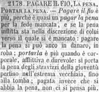 | Pagare il fio, La pena, Portar la pena - Pagare il fio è più, perchè è quasi un pagar la pena per la fede mancata, e se la pena inflitta sta nella discrezione di colui verso il quale si è mancato: pagare la pena si può anco in danaro, in roba; portarla è più quando è corporale, afflittiva e durevole: si porta la pena degli stravizzi della gioventù perfino nell'estrema vecchiaia, fino alla tomba; pagata invece che si abbia la pena, non ci si pensa più. [immagine] |