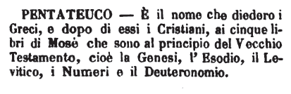 | Pentateuco - E' il nome che diedero i Greci, e dopo di essi i Cristiani, ai cinque libri di Mosè che sono al principio del Vecchio Testamento, cioè la Genesi, l'Esodo, il Levitico, i Numeri e il Deuteronomio. [immagine] |