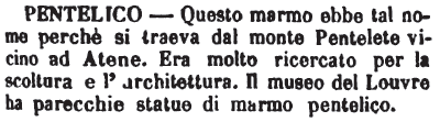 | Pentelico - Questo marmo ebbe tal nome perchè si traeva dal monte Pentelete vicino ad Atene. Era molto ricercato per la scoltura e l'architettura. Il museo del Louvre ha parecchie statue di marmo pentelico. [immagine] |