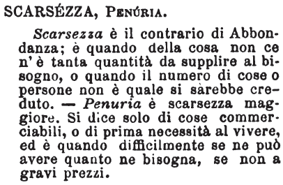 | Scarsezza, Penuria - Scarsezza è il contrario di Abbondanza; è quando della cosa non ce n'è tanta quantità da supplire al bisogno, o quando il numero di cose o persone non è quale si sarebbe creduto. - Penuria è scarsezza maggiore. Si dice solo di cose commerciabili, o di prima neccessità al vivere, ed è quando difficilmente se ne può avere quanto ne bisogna, se non a gravi prezzi. [immagine] |