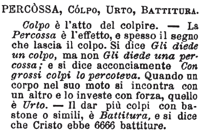 | Percossa, Colpo, Urto, Battitura - Colpo è l'atto del colpire. - La Percossa è l'effetto, e spesso il segno che lascia il colpo. Si dice Gli diede un colpo, ma non Gli diede una percossa; e si dice acconciamente Con grossi colpi lo percoteva. Quando un corpo nel suo moto si incontra con un altro e lo investe con forza, quello è Urto. - Il dar più colpi con bastone o simili, è Battitura, e si dice che Cristo ebbe 6666 battiture. [immagine] |