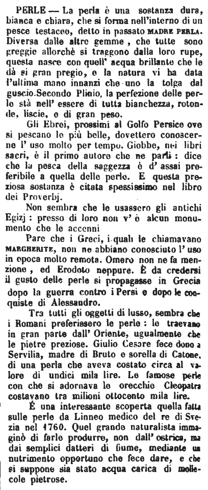 Gli Ebrei, prossimi al Golfo Persice ove si pescano le più belle, dovettero conoscerne l'uso molto per tempo. Giobbe, nei libri sacri, è il primo autore che ne parli: dice che la pesca della saggezza è d'assai preferibile a quella delle perle. E questa preziosa sostanza è citata spessissimo nel libro dei Proverbj. Non sembra che le usassero gli antichi Egizj: presso di loro non v'è alcun monumento che le accenni. Pare che i Greci, i quali le chiamavano margherite, non ne abbiano conosciuto l'uso in epoca molto remota. Omero non ne fa menzione, ed Erodoto neppure. È da credersi il gusto delle perle si propagasse in Grecia dopo la guerra contro i Persi e dopo le conquiste di Alessandro. Tra tutti gli oggetti di lusso, sembra che i Romani preferissero le perle: le traevano in gran parte dall'Oriente, ugualmente che le pietre preziose. Giulio Cesare fece dono a Servilia, madre di Bruto e sorella di Catone, di una perla che aveva costato circa al valore di undici mila lire. Le famose perle con che si adornava le orecchie Cleopatra costavano tra milioni ottocento mila lire. È una interessante scoperta quella fatta sulle perle da Linneo medico del re di Svezia nel 1760. Quel grande naturalista immaginò di farle produrre, non dall'ostrica, ma dai semplici datteri di fiume, mediante un nutrimento opportuno che fece dare, e che si suppone sia stato acqua carica di mollecole pietrose. [immagine] |