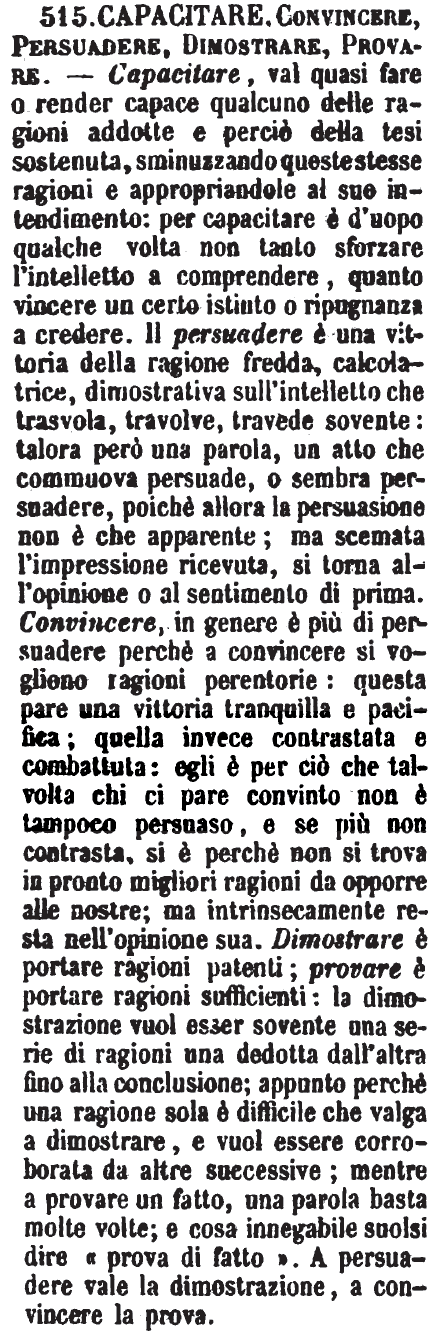 | Convincere, Persuadere - Si Convince la mente per via di prove e d'argomenti; e convinto è colui che viene nella opinione altrui, vinto dalle ragioni di esso e non trovando più ragioni da dirgli contro. - Il Persuadere invece è della mente e del cuore; ed è persuaso colui che, riconoscendo per vero ciò che altri dice, e per ragionevoli i suoi argomenti, viene volontariamente nella sua opinione. [immagine] |