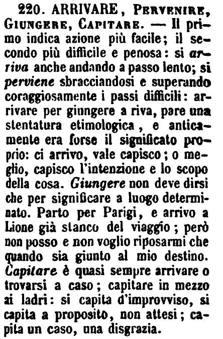 | Arrivare, Pervenire, Giungere, Capitare - Il primo indica azione più facile; il secondo più difficile e penosa: si arriva anche andando a passo lento; si perviene sbracciandosi e superando coraggiosamente i passi difficili: arrivare per giungere a riva, pare una stentatura etimologica, e anticamente era forse il significato proprio: ci arrivo, vale capisco; o meglio, capisco l'intenzione e lo scopo della cosa. Giungere non deve dirsi che per significare a luogo determinato. Parto per Parigi, e arrivo a Lione già stanco del viaggio; però non posso e non voglio riposarmi che quando sia giunto al mio destino. Capitare è quasi sempre arrivare o trovarsi a caso; capitale in mezzo ai ladri: si capita d'improvviso, si capita a proposito, non attesi; capita un caso, una disgrazia. [immagine] |