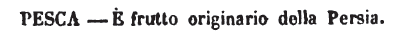 | Pesca - e PERSICA. S. f. (Agr.) Sorta di grosso frutto assai sugoso, ed ha nocciolo in cui è chiusa una mandorla per lo più amara; e ve ne sono di molte specie. Persica malus, Plin.; Persicum malum, Colum. – Pallad. Nov. 7. (C) Due sono generazioni di pesche: duracini, o armeniche. T. Cresc. Agr. volg. 188. Chiarificano il vino con noccioli di pesche. [Cont.] Cit. Tipocosm. 208. Il persico con le persiche sue, e con tutte le specie di esse; cioè pesche duracine, pesche cotogne, sanguigne, pesche noci, pesche mandole, e partitoie. Matt. Disc. Diosc. I. 198. Le persiche, le quali noi in Toscana chiamiamo pesche, sono di più e di diverse sorti; perciocchè delle rosse, delle gialle, delle verdi, delle bianche, e delle vermiglie simili al sangue, delle partitoie, delle duracine, delle cotogne, delle amare, delle brusche, delle saporite, e delle sciocche se ne ritrovano.