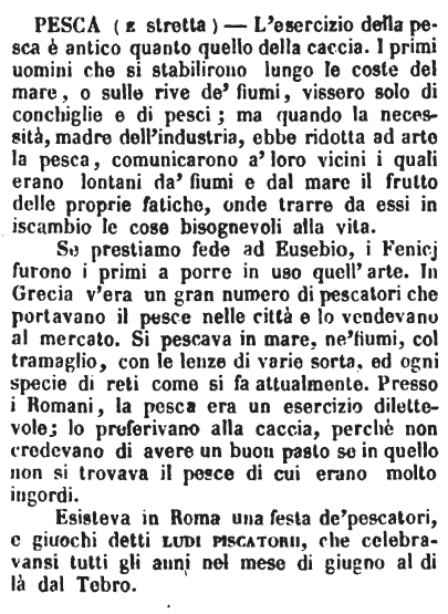 | Pesca (e stretta) - L'esercizio della pesca è antico quanto quello della caccia. I primi uomini che si stabilirono lungo le coste del mare, o sulle rive de' fiumi, vissero solo di conchiglie e di pesci; ma quando la necessità, madre dell'industria, ebbe ridotta ad arte la pesca, comunicarono a' loro vicini i quali erano lontani da' fiumi e dal mare di frutto delle proprie fatiche, onde trarre da essi in iscambio le cose bisognevoli alla vita.