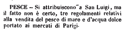 | Pesce - Si attribuiscono a San Luigi, ma il fatto non è certo, tre regolamenti relativi alla vendita del pesce di mare e d'acqua dolce portato ai mercati di Parigi. [immagine] |