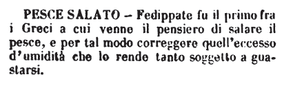 | Pesce salato - Fedippate fu il primo fra i Greci a cui venne il pensiero di salare il pesce, e per tal modo correggere quell'eccesso d'umidità che lo rende tanto soggetto a guastarsi. [immagine] |