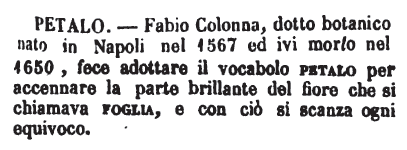 | Petalo - Fabio Colonna, dotto botanico nato a Napoli nel 1567 ed ivi morto nel 1650, fece adottare il vocabolo petalo per accennare la parte brillante del fiore che si chiamava foglia, e con ciò si scanza ogni equivoco. [immagine] |
