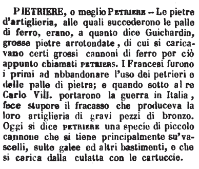 | Pietriere, o meglio Petriere - Le pietre d'artiglieria, alle quali succederono le palle di ferro, erano, a quanto dice Guichardin, grosse pietre arrotolate, di cui si caricavano certi grossi cannoni di ferro per ciò appunto chiamati petriers. I Francesi furono i primi ad addandonare l'uso dei petrieri e delle palle di pietra; e quando sotto al re Carlo VIII. portarono la guerra in Italia, fece stupore il fracasso che produceva la loro ariglieria di gravi pezzi di bronzo. Oggi si dice petriere una specie di piccolo cannone che si tiene principalmente su' vascelli, sulle galee ed altri bastimenti, e che si carica dalla culatta con le cartuccie. [immagine] |