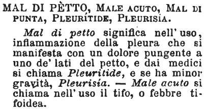 | Mal di petto, Male acuto, Mal di punta, Pleuritide, Pleurisia - Mal di petto significa nell'uso, infiammazione della pleura che si manifesta con un dolore pungente a uno de' lati del petto, e dai medici si chiama Pleuritide, e se ha minor gravità, Pleurisia. - Male acuto si chiama nell'uso il tifo, o febbre tifoidea. [immagine] |