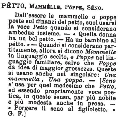 | Petto, Mammelle, Poppe, Seno - Dall'essere le mammelle o poppe poste sul dinanzi del petto, suol usarsi la voce Petto quando si considerano ambedue insieme. - «Quella donna ha un bel petto. - Ha un bambino al petto.» - Quando si considerano partitamente, allora si dicono Mammelle in liguaggio scelto, e Poppe nel linguaggio familiare, salvo che Poppe dà l'idea di maggior grossezza. Queste si usano anche nel singolare: Una mammella, Una poppa. - [Seno s'usa per quel medesimo che Petto, ed essendo propriamente voce poetica, in questo senso, par più nobile e più modesta anche in prosa. - «Porgere il seno al figlioletto.» G. F.] [immagine] |